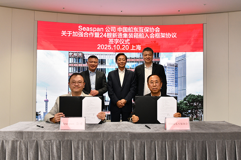 10月20日,Seaspan公司、中国船东互保协会关于加强合作暨24艘新造集装箱船入会框架协议签字仪式在协会上海总部举行。