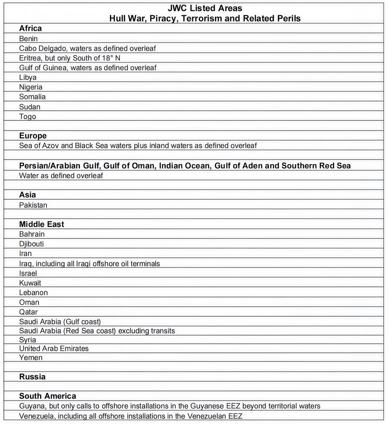 2026年3月3日,联合战争险委员会正式发布JWLA-033号除外区域清单。本次更新在JWLA-032基础上,新增巴林、吉布提、科威特、卡塔尔及阿曼全境(阿曼范围由原穆桑达姆地区扩展至全国)为除外国家;同时将原“波斯湾/阿拉伯湾、阿曼湾、印度洋、亚丁湾及红海南部”区域整合为统一除外水域,其东北/东边界线外推至巴基斯坦65°E经线,涵盖波斯湾、霍尔木兹海峡及阿曼湾相关水域。