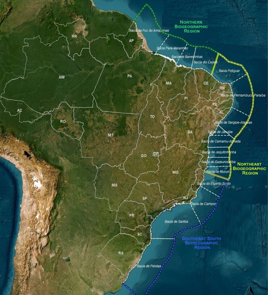 South/Southeast (blue) – stretching between the Maritime Basin of Espirito Santo and the Maritime Basin of Pelotas.